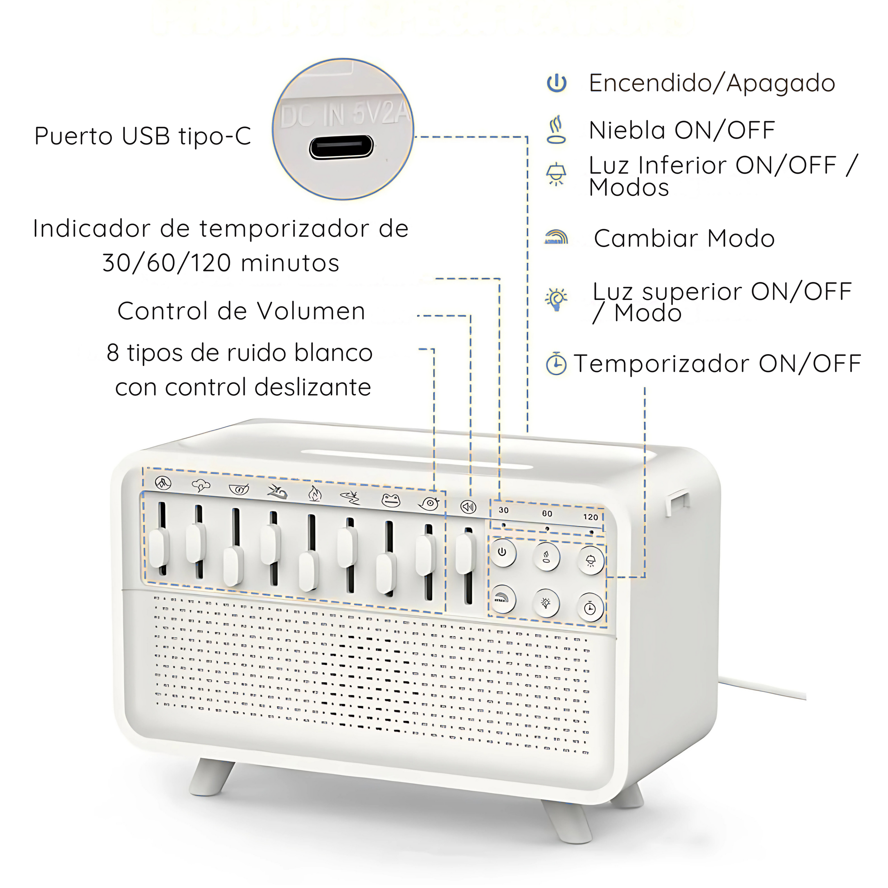 Elimina el ruido, la sequedad y el estrés en segundos. Este humidificador con ruido blanco y luz ambiental crea el ambiente perfecto para relajarte y dormir profundamente. Silencioso, personalizable y con apagado automático.