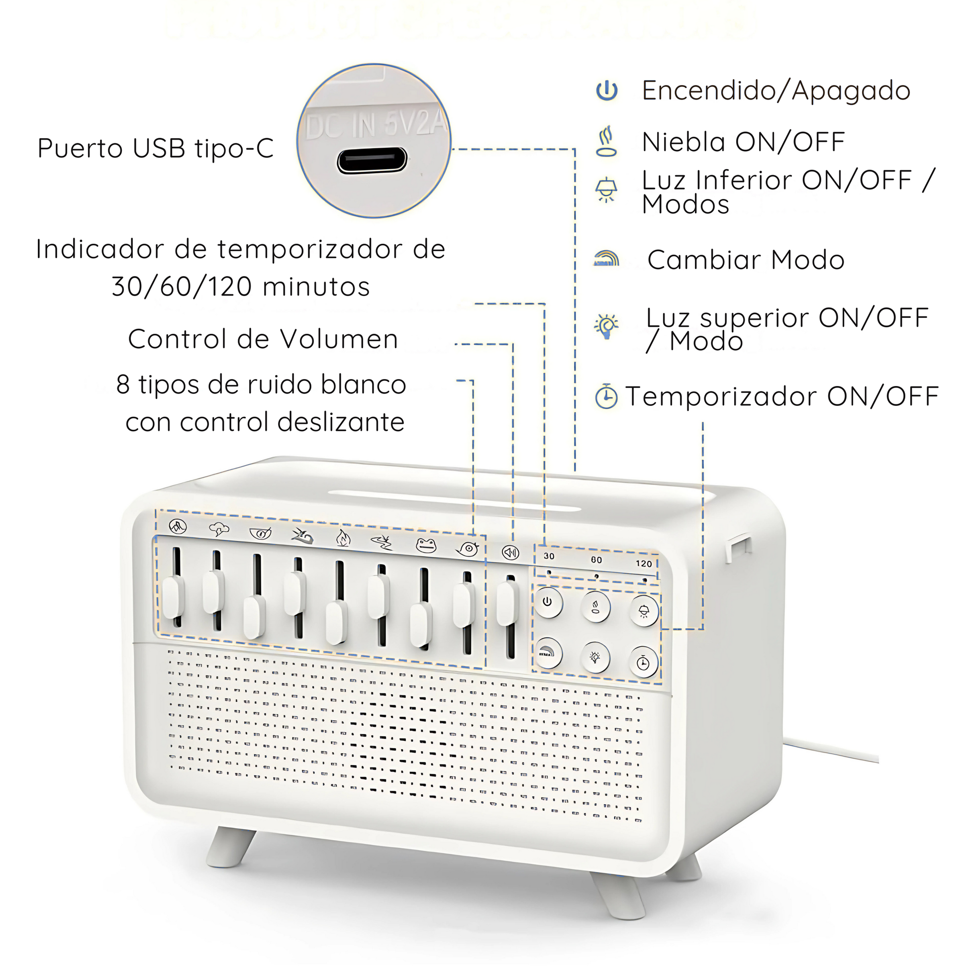 Elimina el ruido, la sequedad y el estrés en segundos. Nuestro humidificador con ruido blanco y luz ambiental crea el ambiente perfecto para relajarte y dormir profundamente. Silencioso, personalizable y con apagado automático.